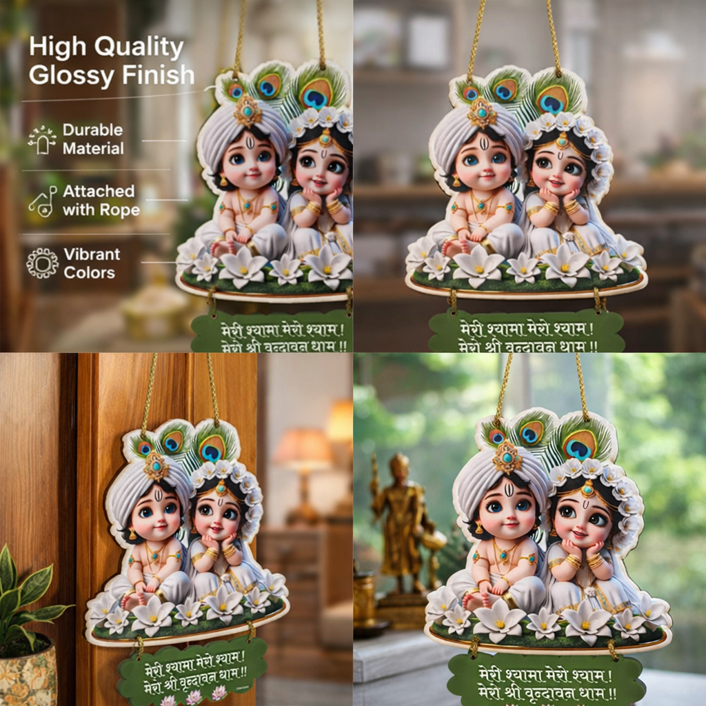 Invite the eternal love and divine energy of Radha Krishna into your sacred space with this beautifully designed Spiritual Wall Hanging. Featuring an adorable Radha Krishna artwork with a devotional Hindi quote, this wall décor instantly creates a peaceful and devotional atmosphere in your home temple, puja room, or meditation space.